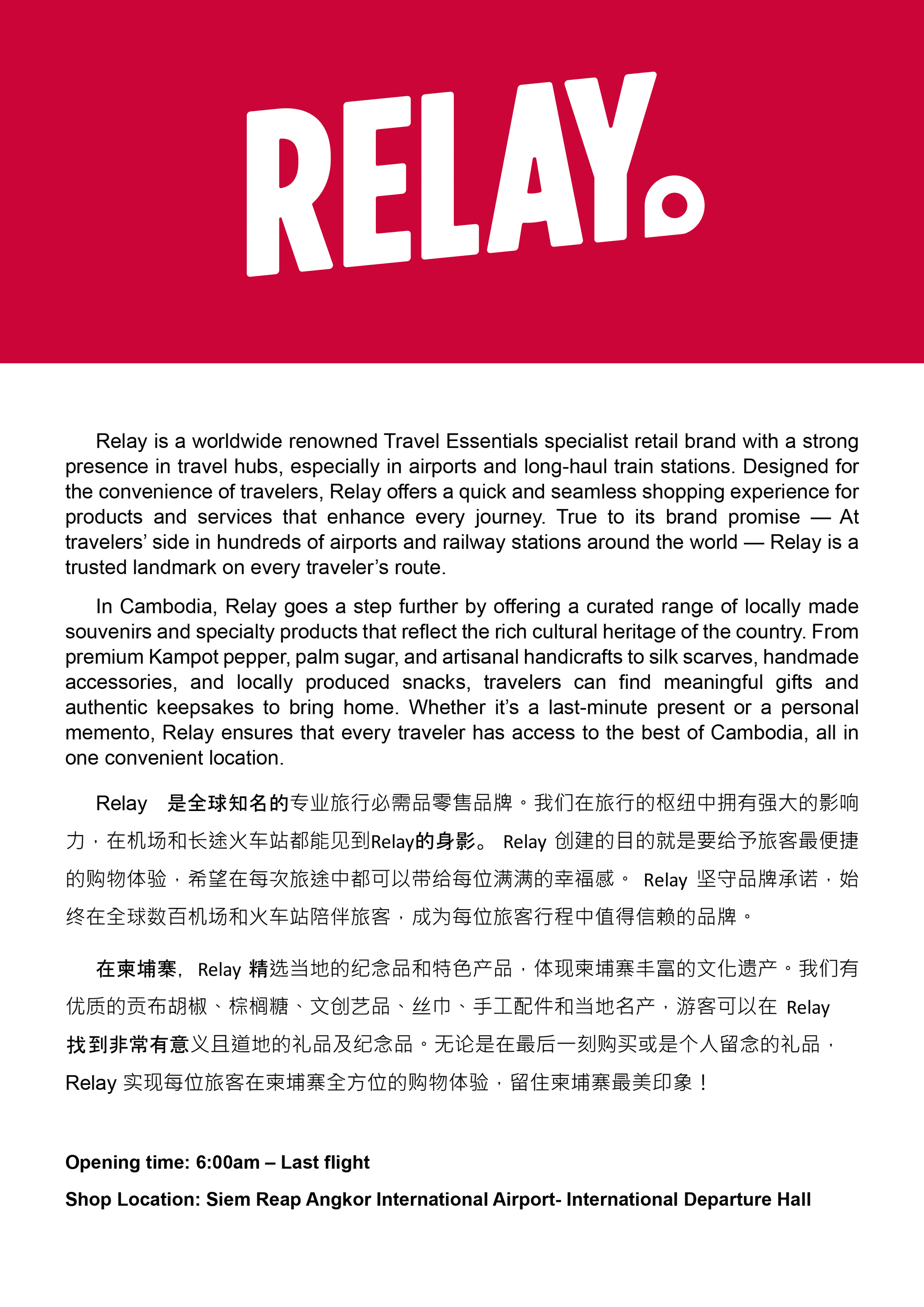 DUTY ZERO by cdf(Siem Reap Angkor International Airport Duty Free Shop) covers a total area of 1,670 square meters, with stores both in the departure hall and in the arrival hall. It mainly sells perfume and cosmetics, jewelry, watches, fashion boutiques, tobacco and alcohol, etc., with hundreds of famous brands at home and abroad. There is also the First “Moutai Family Overseas Airport Exclusive Store". DUTY ZERO by cdf will provide international travelers with a world-class duty-free shopping experience with a wide range of products and excellent services. International departing passengers can enjoy duty-free shopping at the departure hall store after passing through quarantine, immigration and security checks. And international arrival passengers can also enjoy duty-free shopping at the arrival hall store after going through the immigration counters.